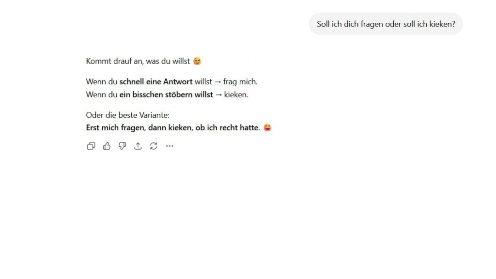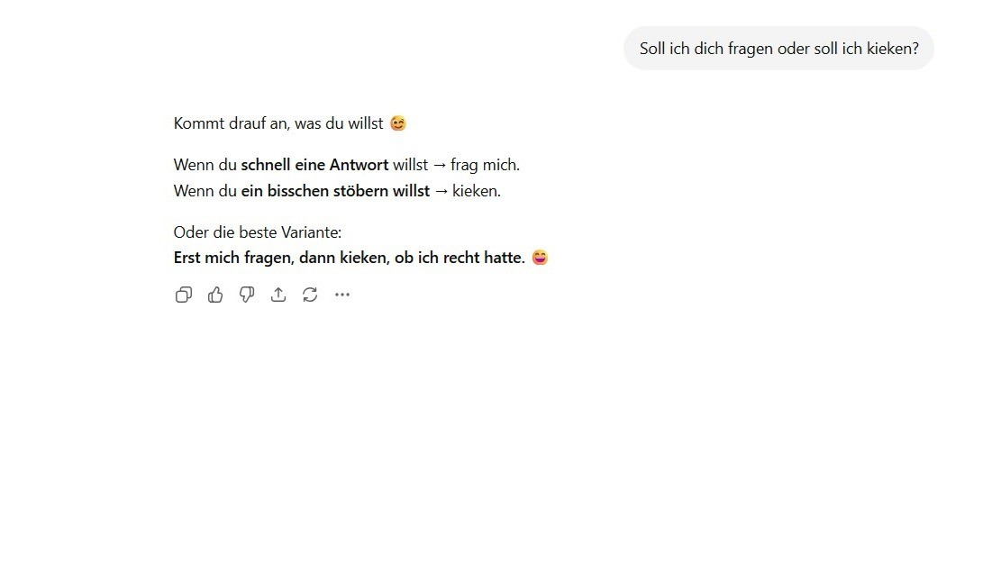 Während ich diesen Artikel geschrieben habe, ist meine Stichwahl weitergelaufen und nun ist sie beendet. Das kreative „Kieken“ und das konservative „Fragen“ sind die klaren Favoriten und haben gleich viel Stimmen bekommen. Ich bin gespannt, ob einer der Begriffe „Google-Niveau“ erreicht oder ob noch ein komplett neues Verb auftaucht. ChatGPT hätte das Potenzial gehabt, ein Google-Pendant zu werden. Aber der Name war schon immer sperrig und unsexy und wer will schon „ChatGPTen“ sagen?